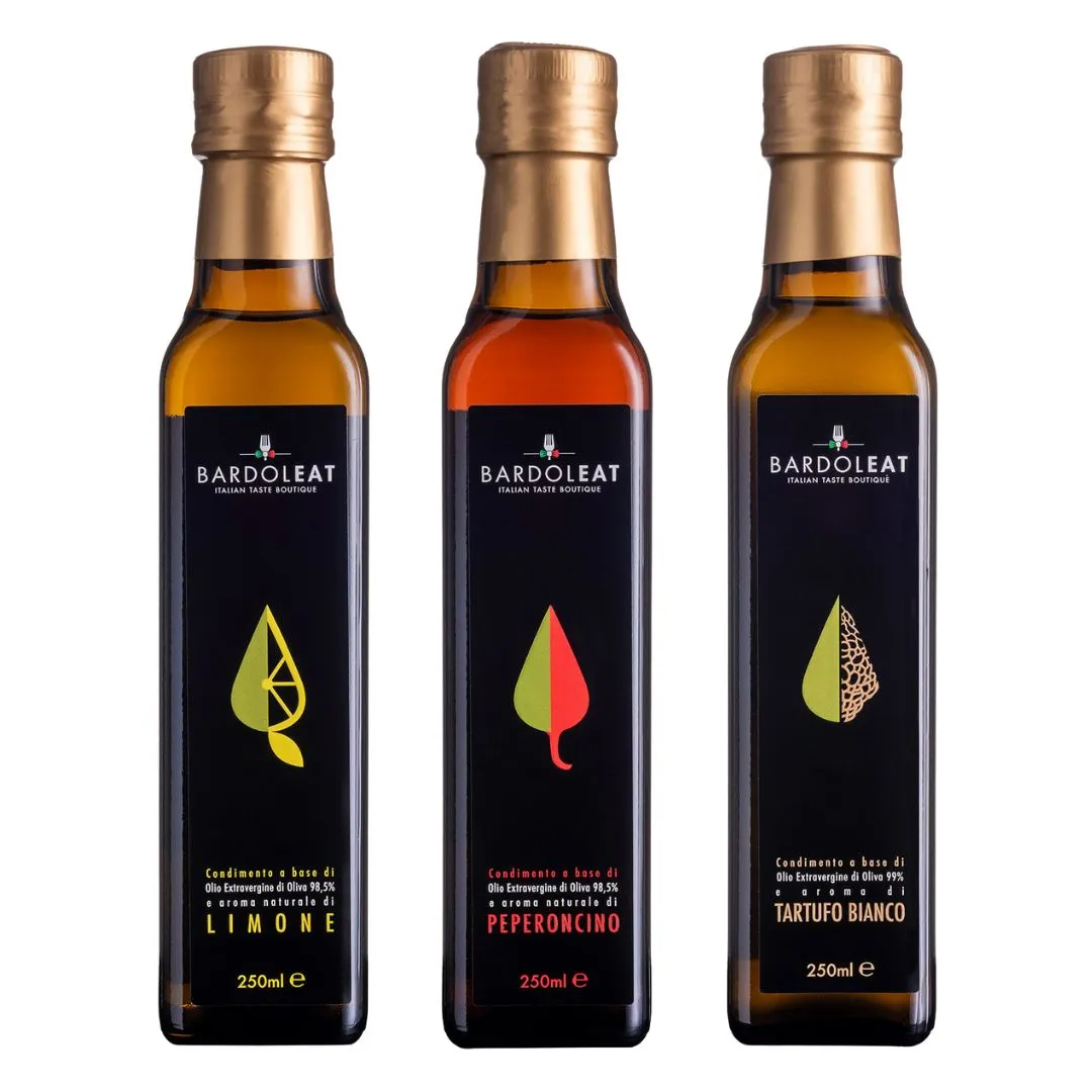 Das Bardoleat Gourmet-Aromen-Trio ist eine Auswahl von drei Würzölen auf Basis von nativem Olivenöl extra, ideal für alle, die ihre Gerichte mit Einfachheit und Charakter verfeinern möchten.